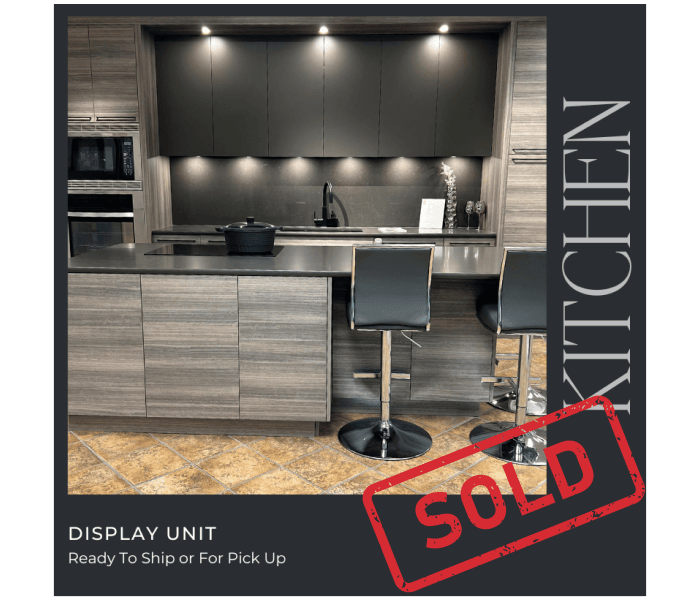 This Modern Design includes Horizontal Grain Textured Melamine and a Super Matte finish in complimentary colours with Light Grey Interiors. This loaded kitchen cabinetry comes complete with:
